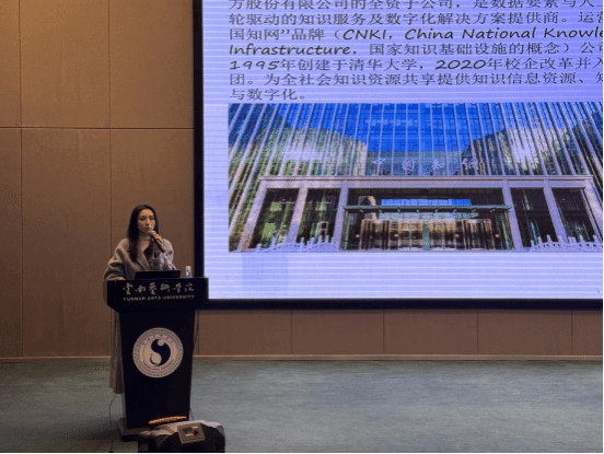 为助力师生提升科研效率、明确 AI 科研应用边界,11 月 28 日下午,云南艺术学院研究生处特邀中国知网西南大区培训讲师罗闰扬,在图书馆报告厅开展 “科研进阶 —— 合理使用 AI,强化科研规范” 专题讲座,百余名2025级研究生与部分学院老师到场参与。讲座由研究生处任为老师主持。